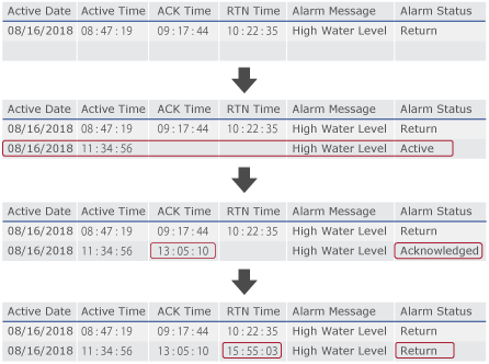 Compare lo stato dell'allarme. Attivo, ACK, Ritorno e UNACK. |