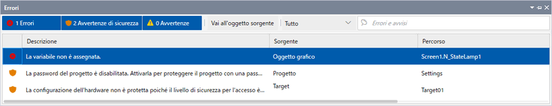 Messaggio di avvertimento che visualizza quando il progetto contiene impostazioni non protette. Anche se questo tipo di messaggio rimane nel progetto, è possibile eseguire trasferimenti o simulazioni del progetto. A meno che non si abbiano ragioni specifiche per mantenere impostazioni non protette, si consiglia di risolvere questo messaggio di avvertimento. |