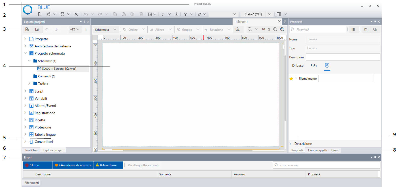 | 5 | Esplora progetti | Questo è il punto di partenza per creare un progetto. Da ciò è possibile percorrere gli elementi del progetto come schermate, variabili, allarmi, impostazioni target, apparecchiature e così via. |