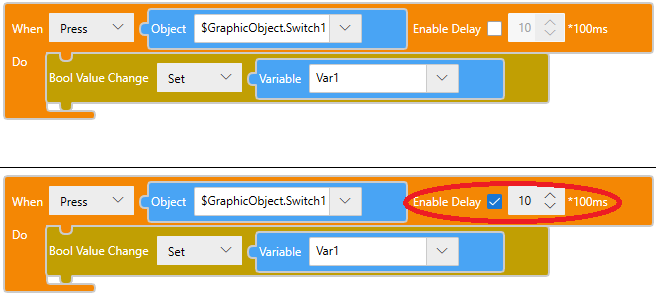 | [Abilitare ritardo] | Utilizzato con le operazioni ON temporaneo e OFF temporaneo, definisce il periodo di tempo in cui l’oggetto deve essere premuto fino a quando la proprietà della sorgente booleana non viene attivata o disattivata. Specificare il tempo di ritardo in unità di 100 millisecondi. se si desidera impostare un ritardo dopo il rilascio dell’oggetto, fino a quando la proprietà della sorgente booleana non viene attivata o disattivata, l’impostazione non è possibile. Al suo posto, disegnare un tasto e creare uno script nel modo seguente. |