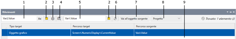Con la finestra [Riferimenti] è possibile cercare le istanze della proprietà della sorgente o del testo specificati nel progetto o negli oggetti composti. È possibile utilizzare la finestra [Riferimenti] per sostituire la proprietà della sorgente o il testo.