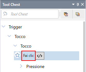 Quando si lavora con gli script in modalità Testo, il Toolchest elenca trigger, operazioni, logica ed espressioni. Fare doppio clic sul trigger e nell’editor di script si crea la nuova sezione di script, insieme al codice predefinito per il trigger selezionato.