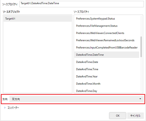 バインディングソースを選択するプロパティセレクターウィンドウで方向を設定します。