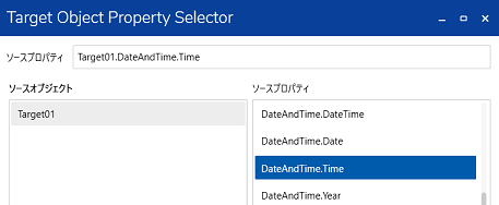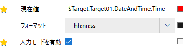 データバインディングの例として、日付/時刻表示 [現在値] プロパティは、表示器の日付/時刻を含むプロパティに関連付けられています。この場合、[現在値] プロパティがバインディングターゲット、日付と時刻を含むプロパティがバインディングソースです。