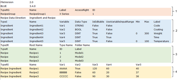 下図の青い文字で表示されている値 (レシピとレシピデータ値) を編集することができます。レシピグループやレシピデータを編集することはできません。