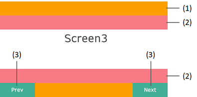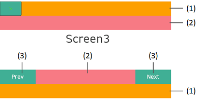 | 画面 3、4 | (1): 第 1 階層マスター画面のヘッダー / フッター(2): 第 2 階層マスター画面のヘッダー / フッター(3): スライドナビゲーションスイッチ |