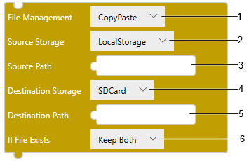 | [Source Path] | コピー、切り取り、削除操作を実行するファイルまたはフォルダーのフルパスを指定します。SP5000 シリーズオープンボックス (Windows 10 IoT Enterprise モデル)、IPC シリーズ、または PC/AT を使用する場合[Source Path] は、[保存先フォルダー (USB ストレージ)] または [保存先フォルダー (SD カード)] 内のパスです。例えば、[Source Path] が “logginggroup01”、[保存先フォルダー (USB ストレージ)] が "C:\USBStorage" である場合、フルパスは “C:\USBStorage\logginggroup01” です。[保存先フォルダー (SD カード)] および [保存先フォルダー (USB ストレージ)] は、[システム設定] ➞ [Target01] ➞ [機能] タブ ➞ [オプション] サブタブ ➞ [プリファレンス] にあります。 |