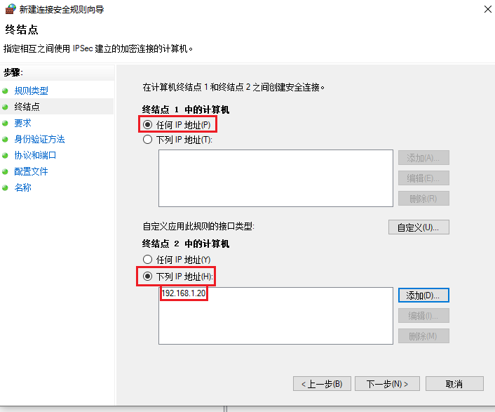| [端点2] | 选择[这些 IP 地址:]并添加人机界面的 IP 地址。 |