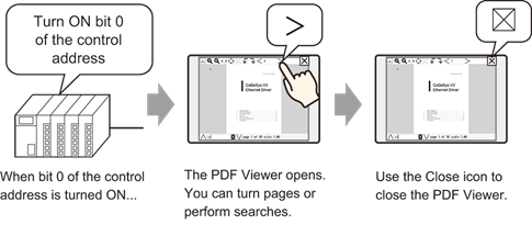 Turn ON bit 0 of the specified control word address to display the PDF stored in the external storage on the display unit.