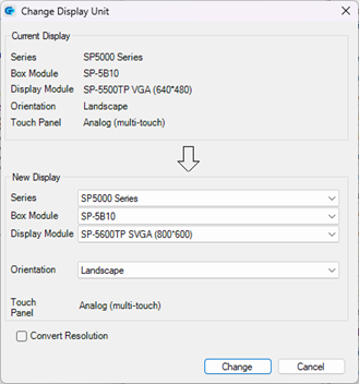 Even if the size of the display screen area changes on changing the display unit model, parts drawn on the screen appear in the same size and location as before the model change. To adjust the part size and the position relative to the resolution of the display unit model, select the [Convert Resolution] check box.