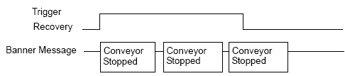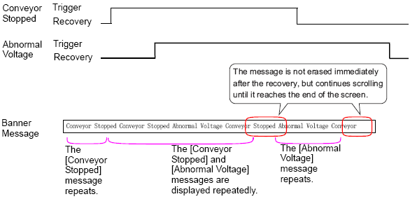 All active Alarm messages repeatedly scroll on the screen. When the [Conveyor Stopped] alarm recovers halfway through a message, the final [Conveyor Stopped] message scrolls until it is finished. After that the [Abnormal Voltage] message displays repeatedly. When the [Abnormal Voltage] alarm recovers, the final instance of the message scrolls until it is finished.