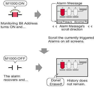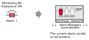 When the Monitoring Bit Address turns ON, the Alarm messages scroll across the screen.