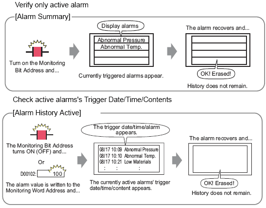 Active alarms are displayed in ascending order of registered Monitor Bit Addresses. |