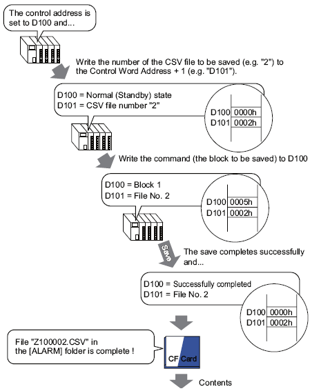 To save data to the CF card, manage the designated control word address as follows: