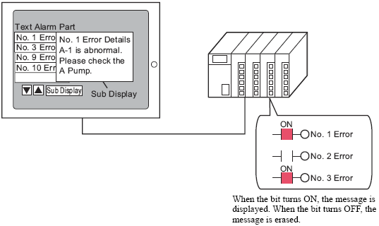 A Message registered on a Text Screen is displayed by each row. (It does not need to be registered in Common [Alarm].)