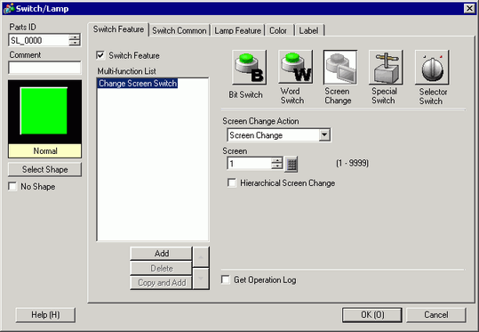 In [Screen Change Action], select the action for changing screens, and set the screen number of the destination screen (for example, 1).