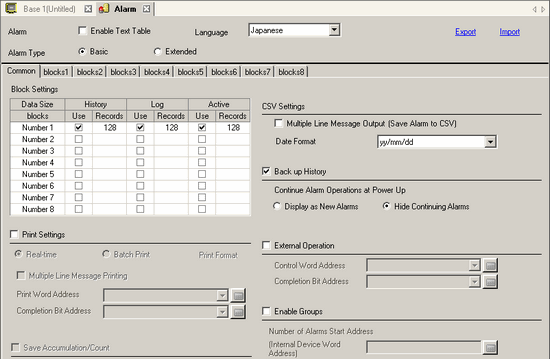 When the [Backup History] check box is not selected, the alarm history data will be erased when the display unit is turned OFF or reset.