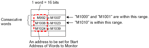 In [Start Address of Words to Monitor], set the start address of the Bit Address registered in [Alarm] by using the value converted into a 16-bit Word. For example, to display the message of the registered monitoring bit "M1000" in a Summary, specify "M992" in [Start Address of Words to Monitor], because addresses from M992 to M1008 are included in one Word.