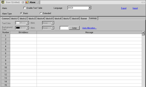 For the Monitoring Bit Address, please use a Word-designated Bit device, or a Bit-designated Word device. Please allocate the Monitoring Bit Addresses of the Alarm Messages displayed in a single Alarm Part (Summary) as continuous addresses inside the same device. It cannot be set over different types of devices.