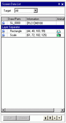 From the [View (V)] menu, select [Work Space (W)] then [Screen Data List (L)] to open the layer separator. The objects above the layer separator are positioned on the Base Layer, and the objects below the layer separator are positioned on the Front Layer.