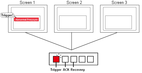 If you want to display alarm history for the whole project, set a lamp alarm part to a global function. If you want to display alarm history for each screen, set a lamp alarm part to a screen function (local function).