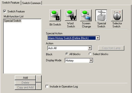 This section explains the procedure of monitoring the alarm trigger set on block 1 for the whole project. Set up switches so that Switch 1 turns on in red when an alarm is triggered, and so the alarm is cleared by pressing Switch 5.