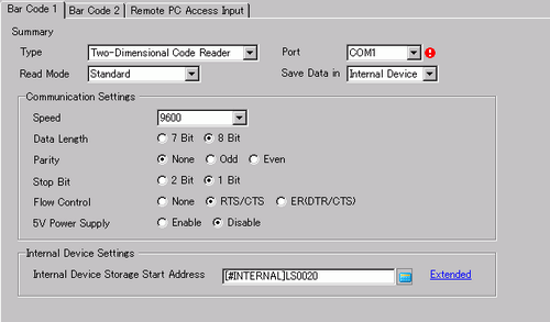 Configure settings to store the data from a two-dimensional code reader in the device address of Device/PLC by using an internal device of the display unit.