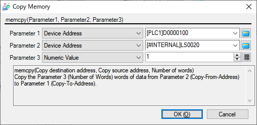 Double-click [Copy Memory], and in the dialog box that follows, define the parameters for the destination address (device address of Device/PLC), source address (internal address), and number of words.
