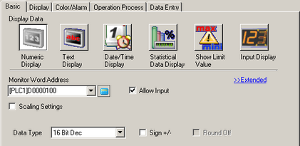 If necessary, set the Data Display color and text on the [Color/Alarm] and [Display] tabs, and click [OK].