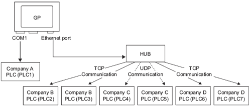 For example, Company A's driver (serial communication) is set to COM1, and Company B, C, and D's drivers are set to the Ethernet port (Ethernet communication).