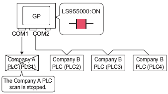 You can stop communication with a specific device/PLC during RUN mode. In the communication scan control address, change the bit corresponding to the device to stop and restart communication.