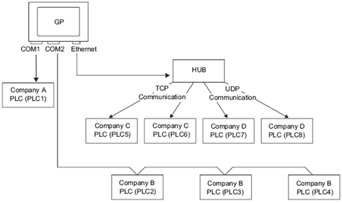Multiple devices/PLCs can be connected simultaneously to one display unit using four drivers (for COM1, COM2, and Ethernet (UDP/TCP)).