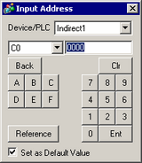 icon to display the [Input Address] dialog box. From the [Device/PLC] list select the indirect device "Indirect1". For the device address set "C00000". Click [Ent].