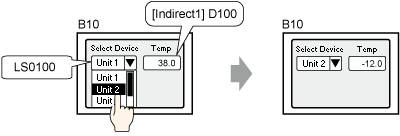 In the Data Display, specify the address (D100) in the indirect device (Indirect1).
