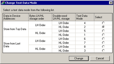 When the [Change Text Data Mode] dialog box is displayed, you can change the text data mode. Normally the text data mode is specified according to each device/PLC.