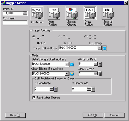 Executes the action designated in [Mode] when the [Trigger Bit Address] changes from OFF to ON.