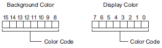 As shown below, display color code is stored in bits 0 to 3, and background color code is stored in bits 8 to 11. See the following for information about color codes.