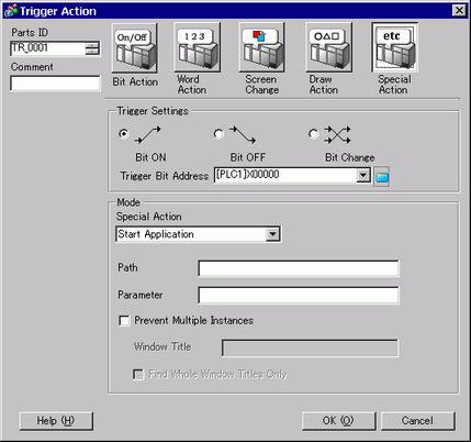 Executes the action designated in [Mode] when the [Trigger Bit Address] changes from OFF to ON.