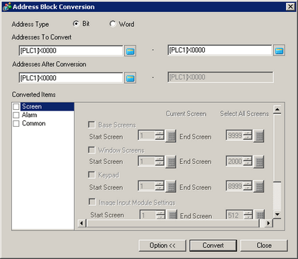 From the [Project (F)] menu, point to [Utility (T)] and select [Convert Addresses (A)]. The [Address Block Conversion] dialog box appears.