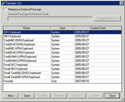 Displays the Package File List registered in GP-Pro EX. You can register your original created parts, drawings, etc. as a package in a package file. By importing and exporting package files, you can use the same package in multiple development environments (computers on which you created a package).