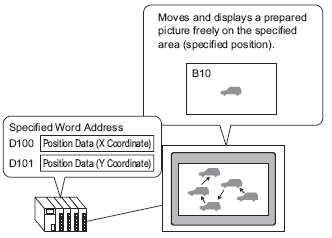 You can store the X/Y coordinates in the specified word address and load pictures from other display screens to the specified coordinates. You also move the display in a straight line between two points.