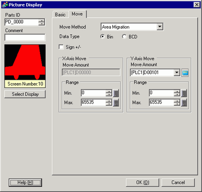 In the Picture Display dialog box, click the [Move] tab and set up the [Move Method] and [Data Type]. In [Move Method] select Area Migration, and in [Data Type] select Bin.