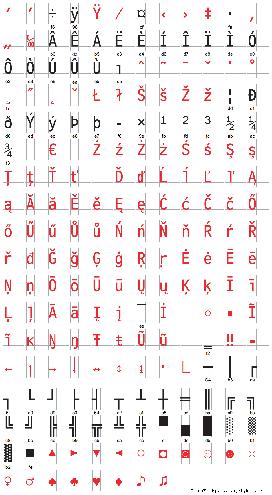 Only characters shown in black will be display in the following chart. Characters shown in red cannot be displayed at a Data Display [Text Display].