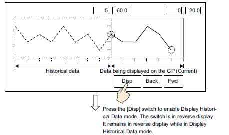 When using a Historical Trend Graph featuring the Display Historical Data function, the excluded dotted-line in the diagram is available for display on the screen. By touching the Display Historical Data Switch, past data stored in the display unit can be viewed on the graph.