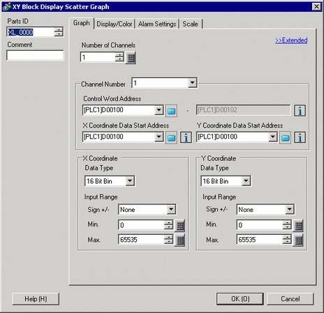 3. Set an address for controlling the graph display to [Control Word Address] (for example, D100), and set addresses to [X Coordinate Data Start Address] (for example, D200) and [Y Coordinate Data Start Address] (for example, D300).