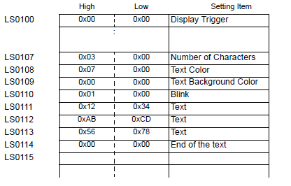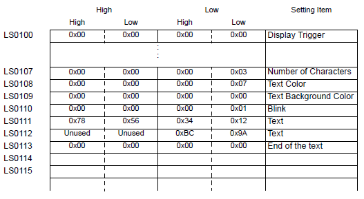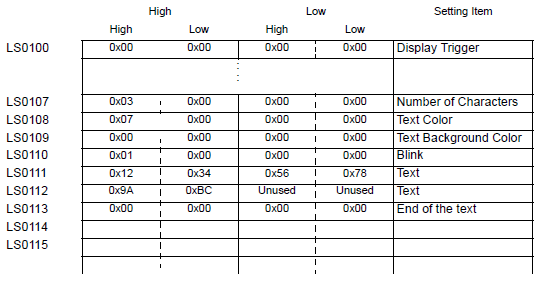 For example, when LS0100 is specified for the internal address and three characters with text data of 0x1234, 0xABCD and 0x5678 are stored (Display Trigger: 0, Text Color: 7, Text Background Color: 0, Blink: 1)