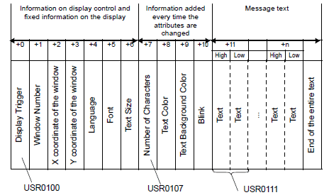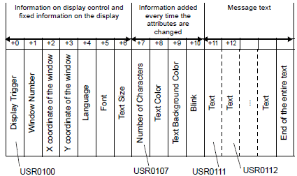 Number of Characters (Specified Address+7), Text Color (Specified Address+8), Text Background Color (Specified Address+9) and Blink (Specified Address+10) must be set collectively as one setting.
