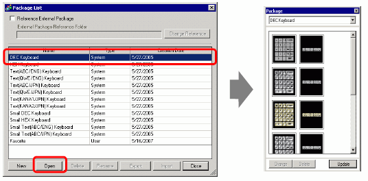 Select the package name (for example, DEC Keypad) that is registered with the keypad you want to use, click [Open], and the [Package] dialog box appears.