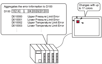 Use a single lamp on the display unit to display in different colors the ON/OFF state of each of the 16 bits in a PLC word address.