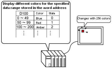 You can configure multiple range settings, and specify lamp color and shape for each range. The color and shape of the lamp changes based on which range the value of the word address falls into. You can set up 1 to 256 ranges.